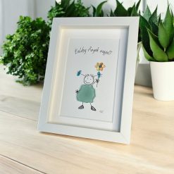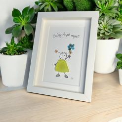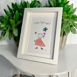 Egyedi, kézzel készült grafikás kép, amelyben a mosolygós kislány teste természetes kőből készült. A kis virág a kezében és a kedves felirat még különlegesebbé teszik ezt a szeretetteljes ajándékot. Tökéletes választás Anyák napjára – szívhez szóló, maradandó emlék.