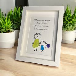 Egyedi, kézzel készült grafikás kép, amelyben a mosolygós kislány teste természetes kőből készült. A kis virág a kezében és a kedves felirat még különlegesebbé teszik ezt a szeretetteljes ajándékot. Tökéletes választás Anyák napjára – szívhez szóló, maradandó emlék.