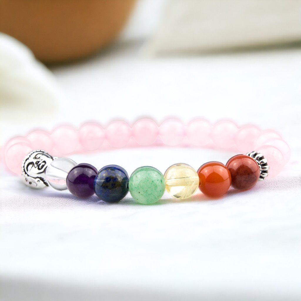Hét csakra rózsakvarc ásványkarkötő Buddha medállal
