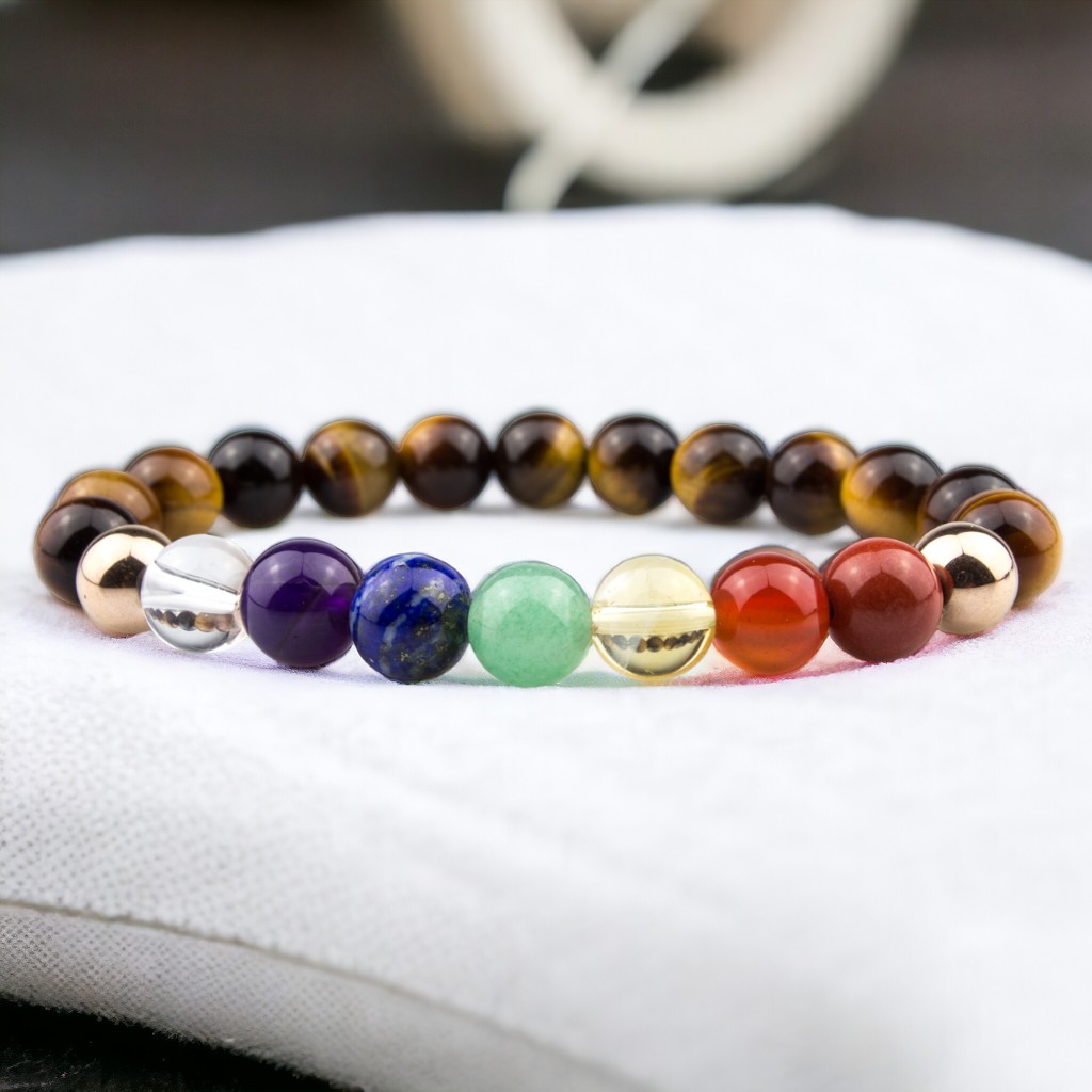 Hét csakra tigrisszem ásványkarkötő rozé hematittal