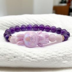 Ez a különleges Labubu Design karkötő két csodálatos ásvány, az ametiszt és a kunzit erejét ötvözi egy játékos, rózsaszín Labubu figurával. A lila ametiszt nyugtató hatásáról ismert, míg a kunzit gyengéd, szeretetteljes energiát közvetít. Egyedi kiegészítő, ami nemcsak a stílusodat emeli ki, hanem pozitív kisugárzásoddal is összhangba kerül.