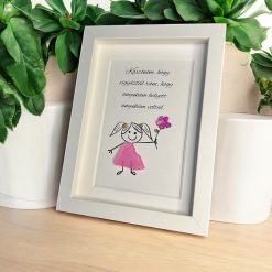 Egyedi, kézzel készült grafikás kép, amelyben a mosolygós kislány teste természetes kőből készült. A kis virág a kezében és a kedves felirat még különlegesebbé teszik ezt a szeretetteljes ajándékot. Tökéletes választás Óvodai köszönőajándéknak – szívhez szóló, maradandó emlék.