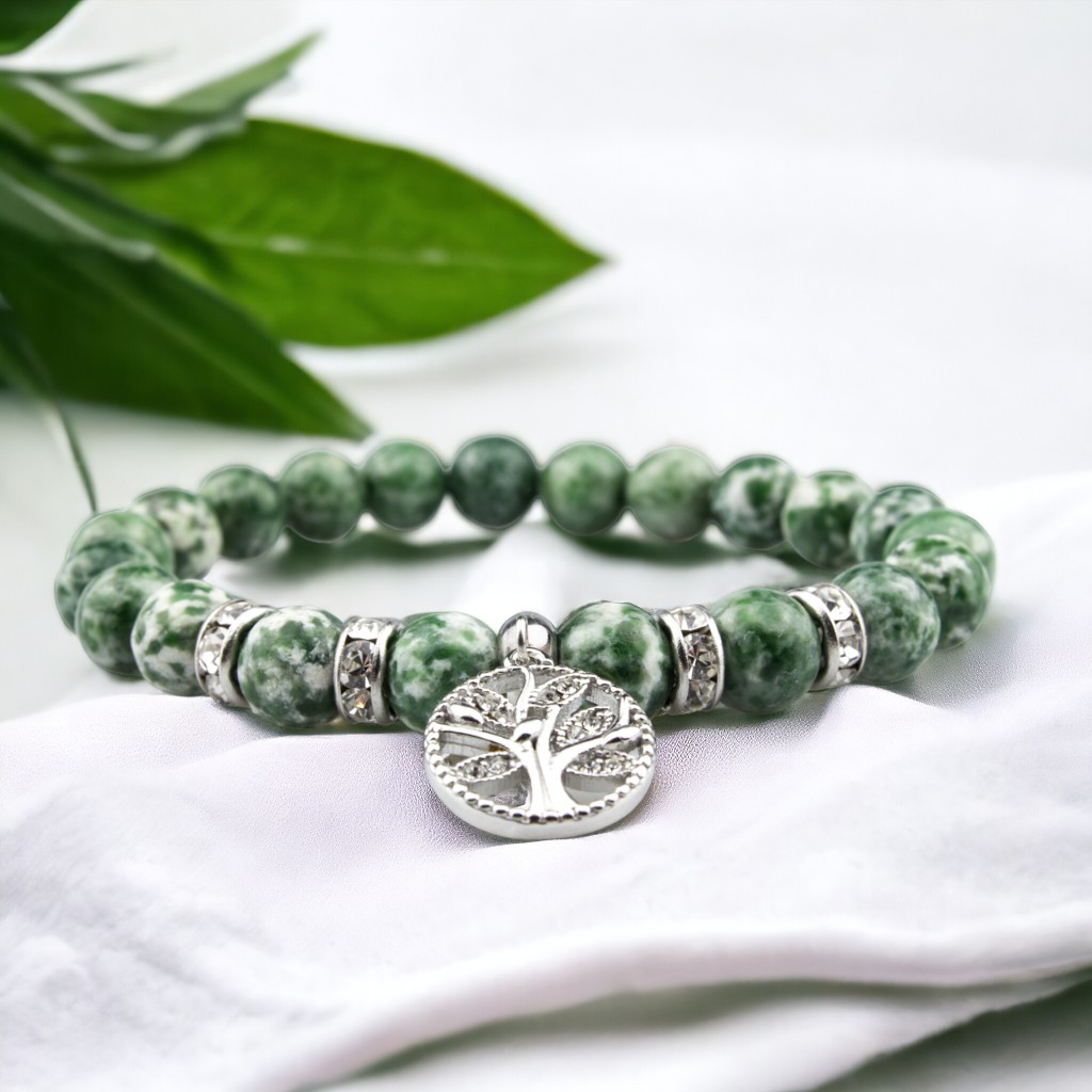 Zöldpettyes jáde ásványkarkötő nemesfém Életfa medállal